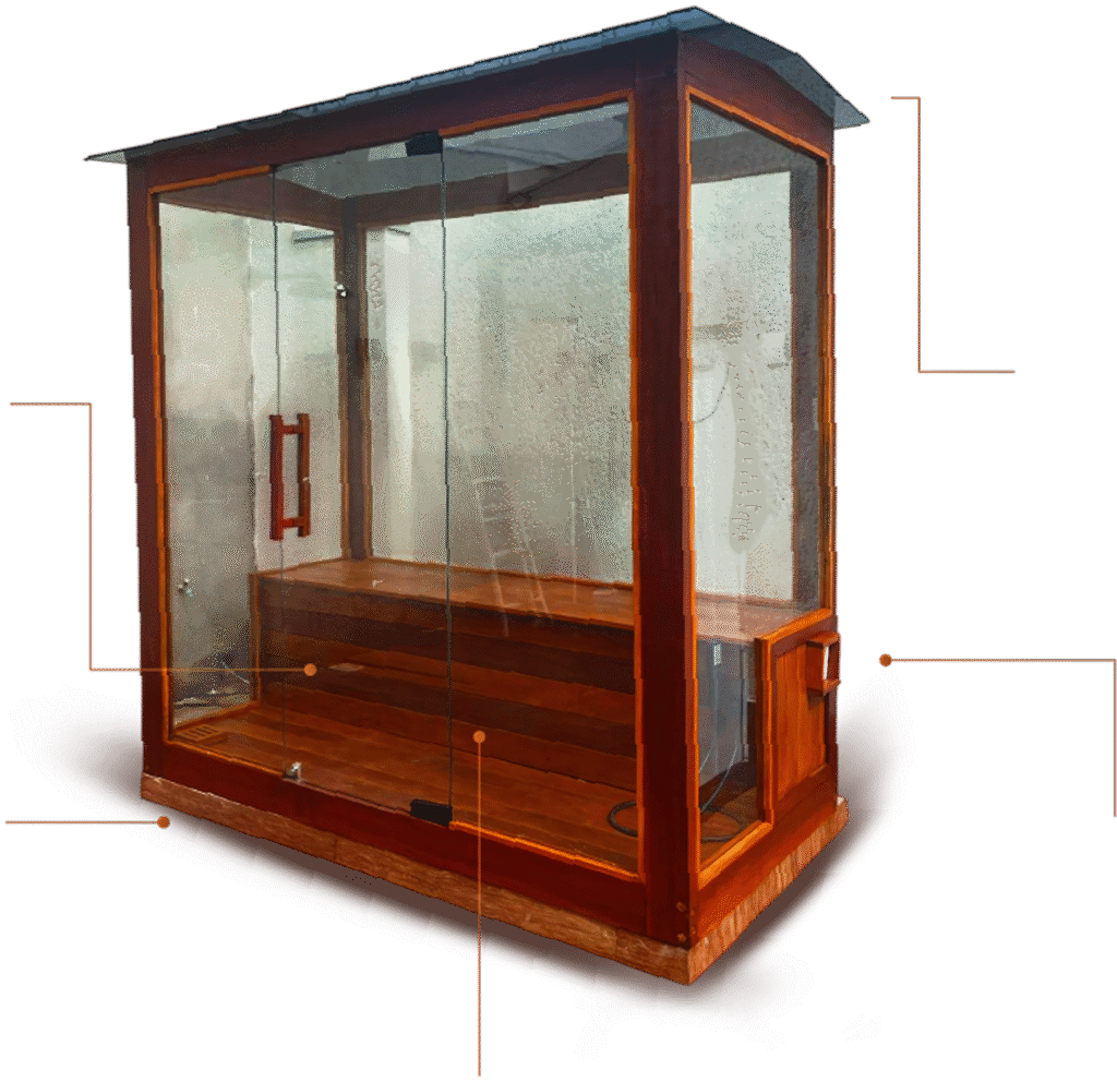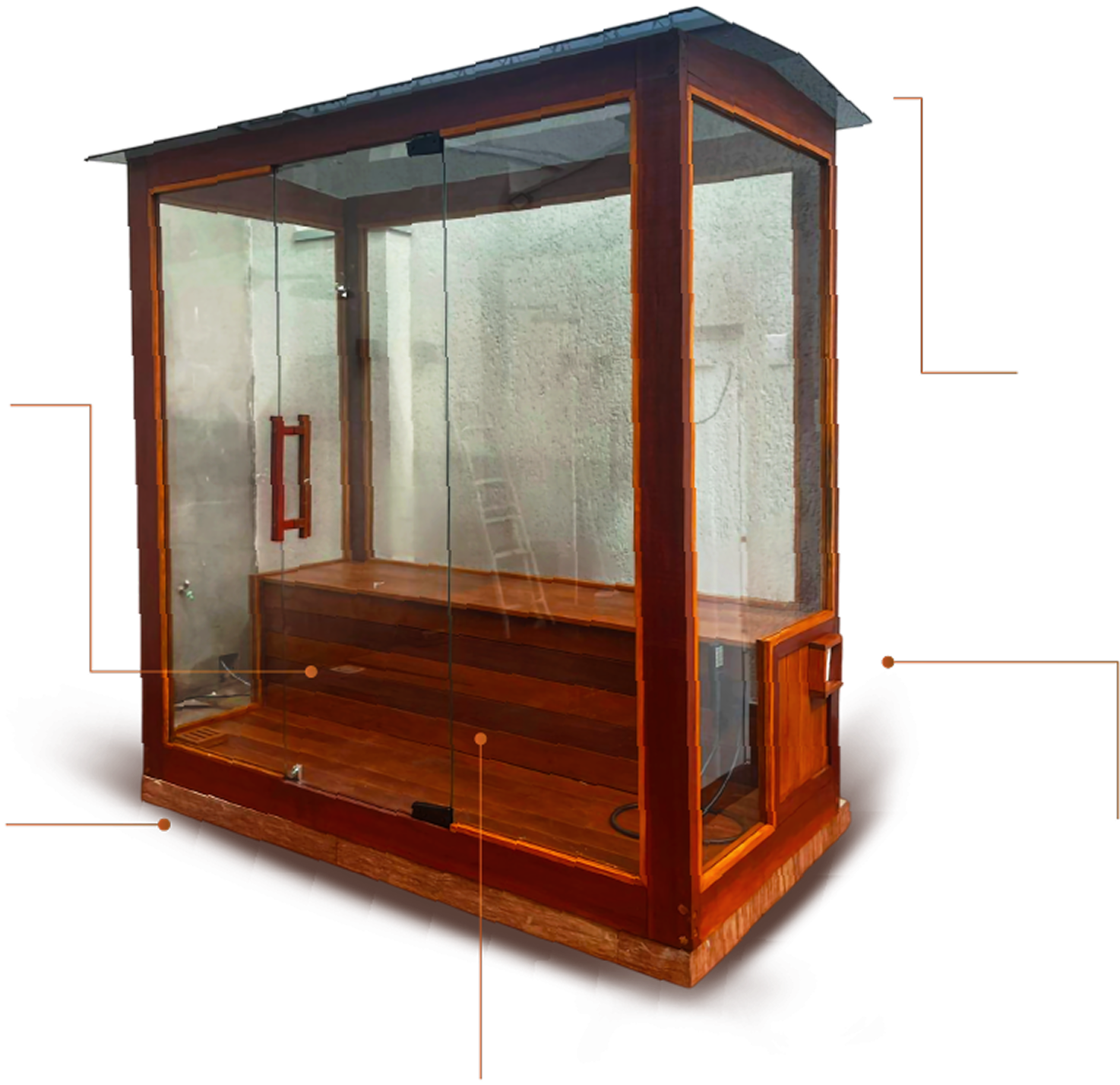 Fica instalado embaixo do banco, fora do alcance de quem está usando. Isso deixa a sauna mais segura, bonita e com espaço melhor aproveitado.