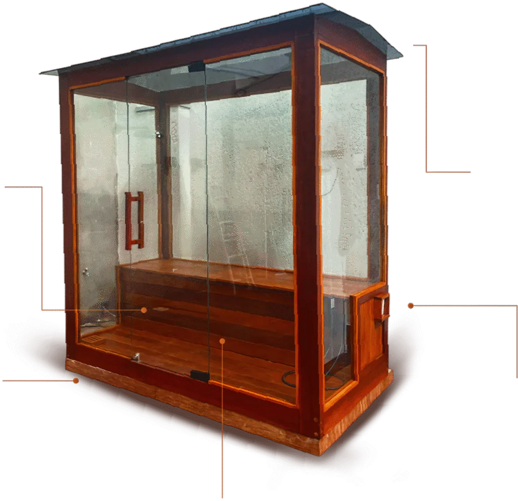 O teto tem uma leve inclinação pra evitar que o vapor vire gotas pingando em quem está usando a sauna. Mais conforto durante o uso.